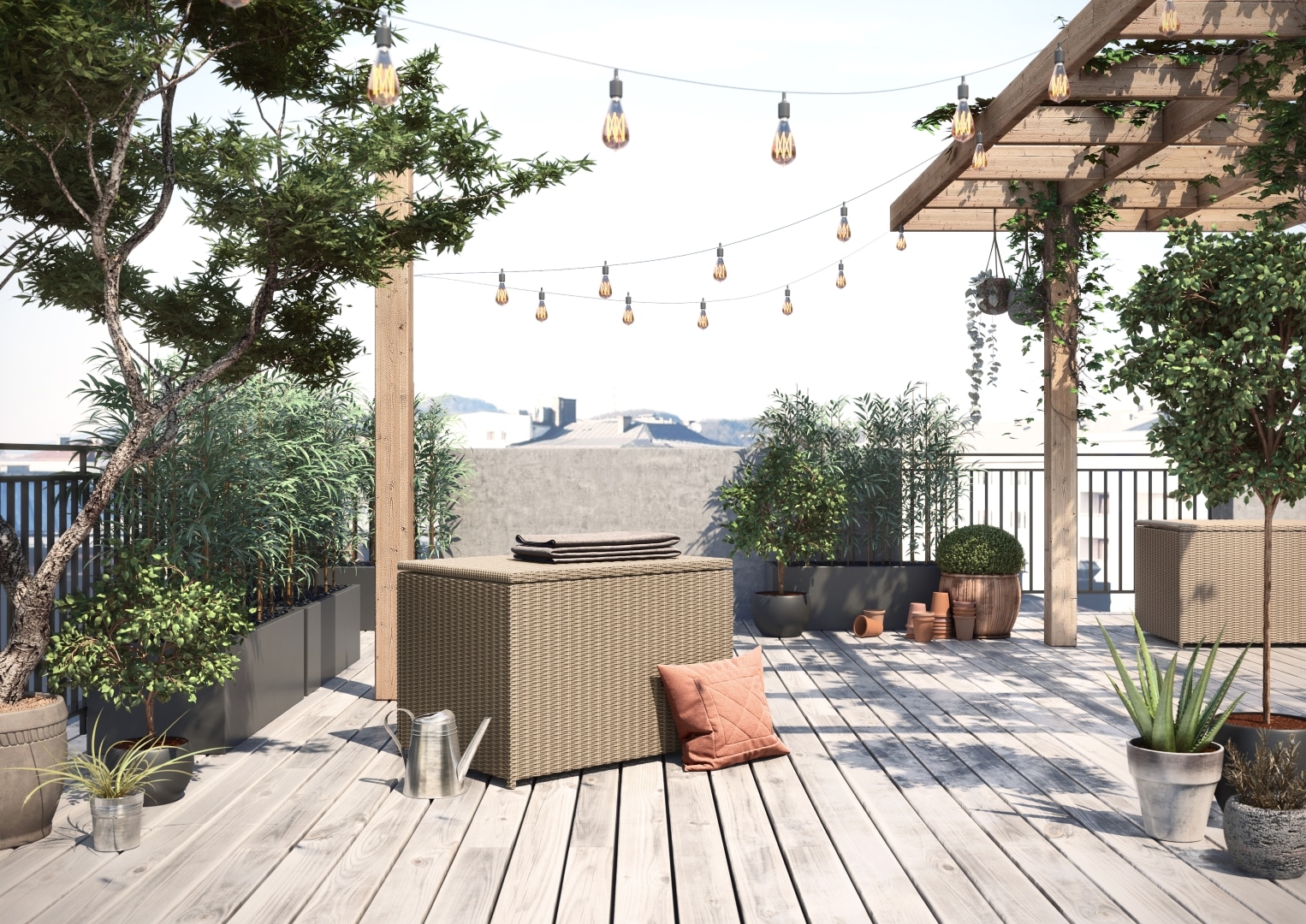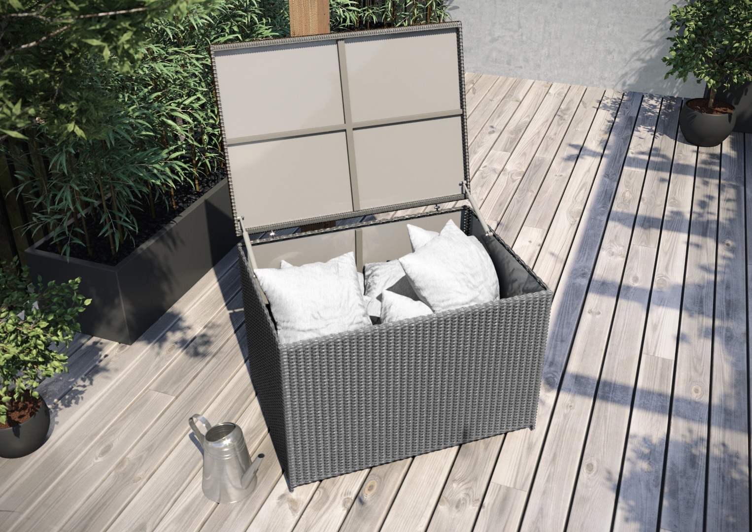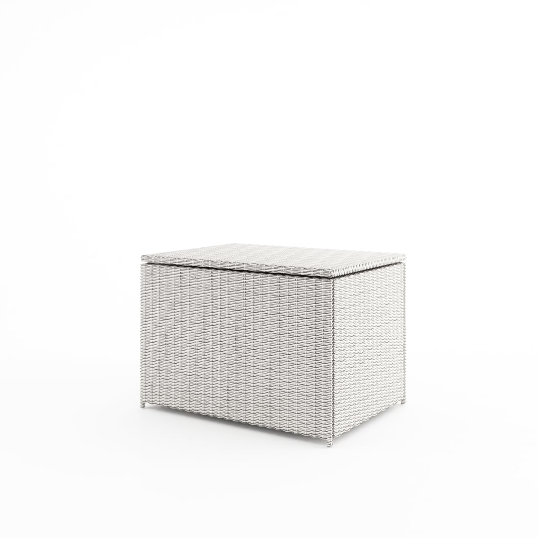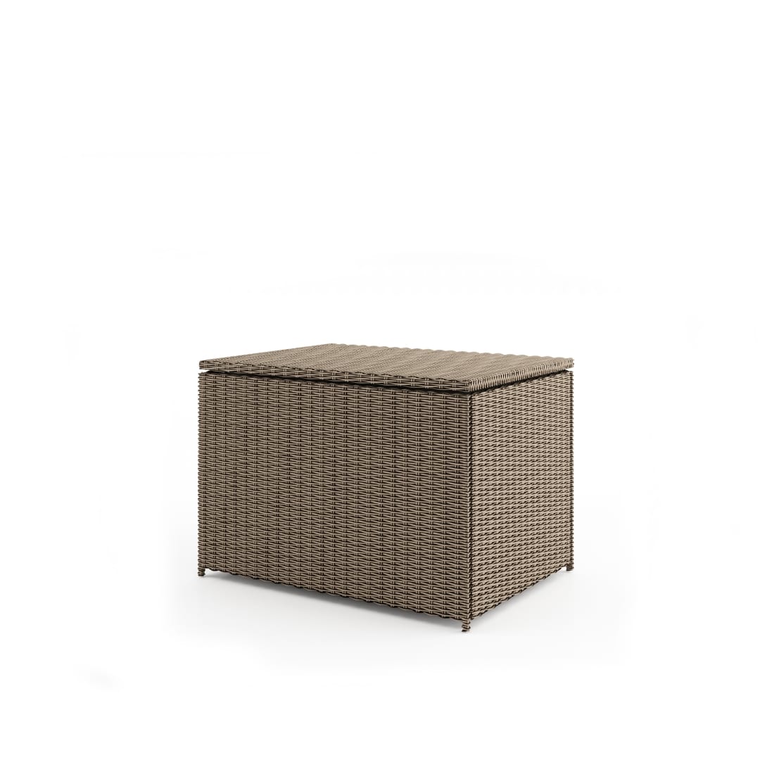 Rattan tároló, rattan párnatartó. Szerkezete hegesztett alumíniumból készült. Külső borítás kiváló minőségű poliuretán. Méretei: 100x70x72 cm